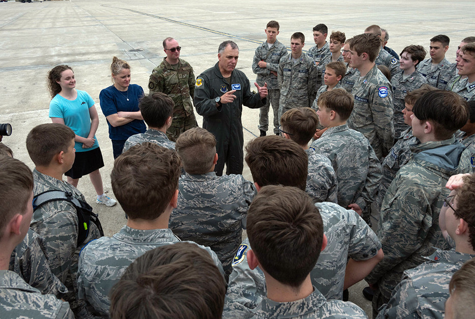 After receiving congratulations from fellow servicemembers, Butler gathered CAP cadets and adult members for a heartfelt speech reflecting on his roots as a cadet in CAP’s California Wing as well as the Civil Air Patrol service of his wife and son. He then invited the CAP visitors to tour the aircraft’s exterior.