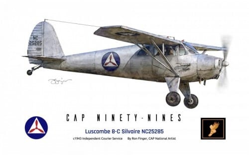 The Luscombe 8-C, NC25285, was one of the models Kenyon flew as a CAP courier aircraft. The sporty “Silvaire” was introduced in 1941 with a 75-horsepower fuel-injected Continental engine.