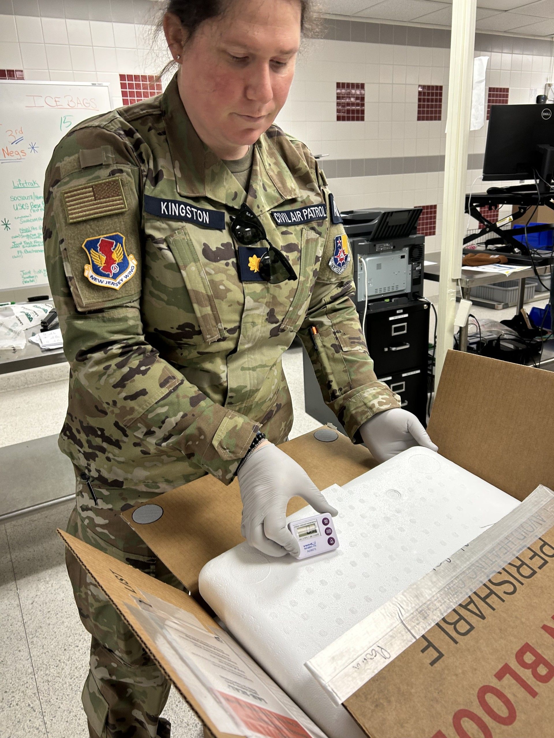 Maj. Megan Kingston, the New Jersey Wing’s health services officer, packs blood products for overseas transport.