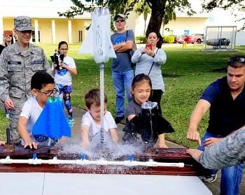 The cadets spent the first half of the day using their knowledge of rocketry mechanics, safety and aerospace principles to assist students in making water bottle rockets from everyday household items. The cadets and students then ended the day by launching the rockets and watching them dart into the sky.