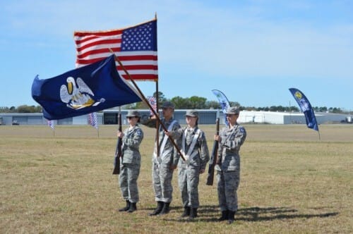 Cadet Chief Master Sgt. Wesley Felice and Cadet Senior Master Sgt. Abbigale Rougeau carried the U.S. and Louisiana flags, with Cadet Senior Airmen Samantha Jordan and Allyssa Rougeau serving as rifle guard.