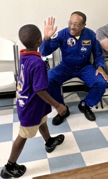 Retired U.S. Air Force Lt. Col. Joseph Muhlberger, vice president of the local AFA Waterman–Twining Chapter, and chapter president retired U.S. Air Force Col. Bill Yucuis also presented shirt donations and pledged continued support for the school’s educational and mentoring programs.