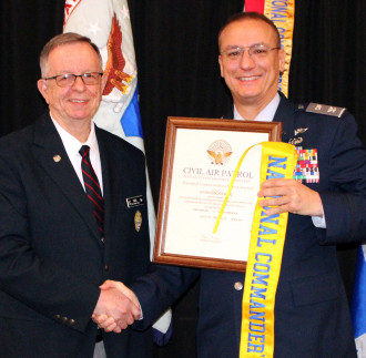 Col. Kevin Pegelow, South Dakota Wing commander, accepted the award from Col. Tom Theis, North Central Region commander, at the joint region and wing conference May 3.